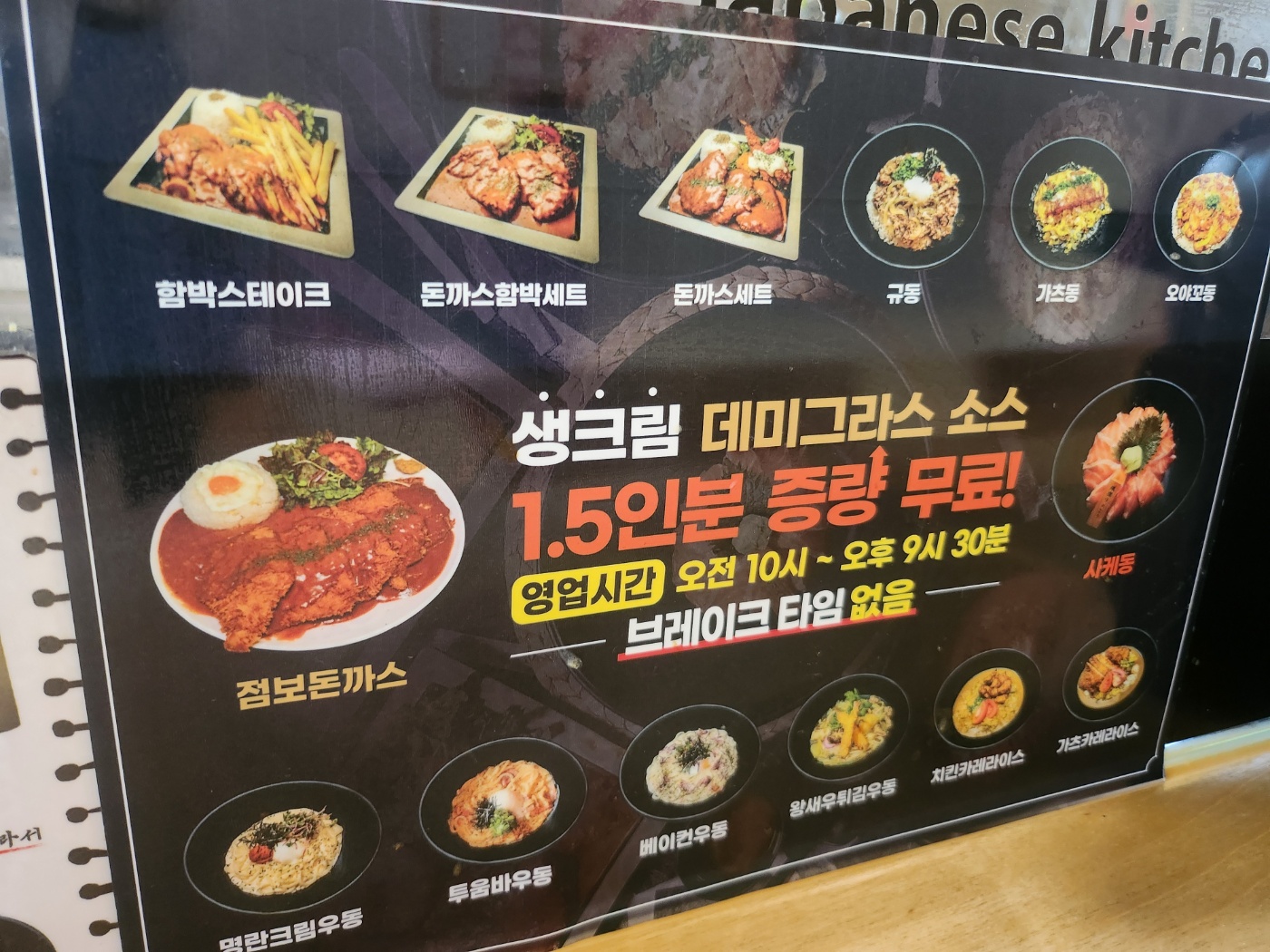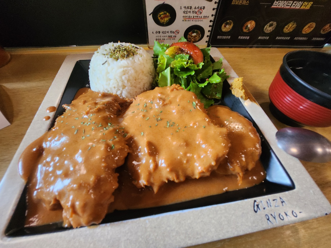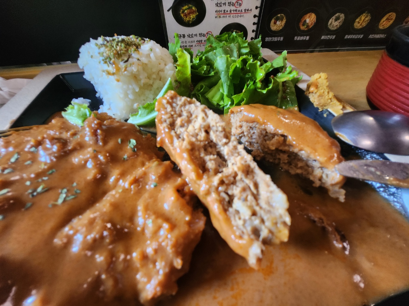 메뉴판을 보면 돈까스와 함박을 다양하게 조합할 수 있는 구성이 많았는데, 그중에서도 데미그라스 소스를 곁들인 세트가 가장 인기 메뉴라고 해서 고민 없이 선택했습니다.