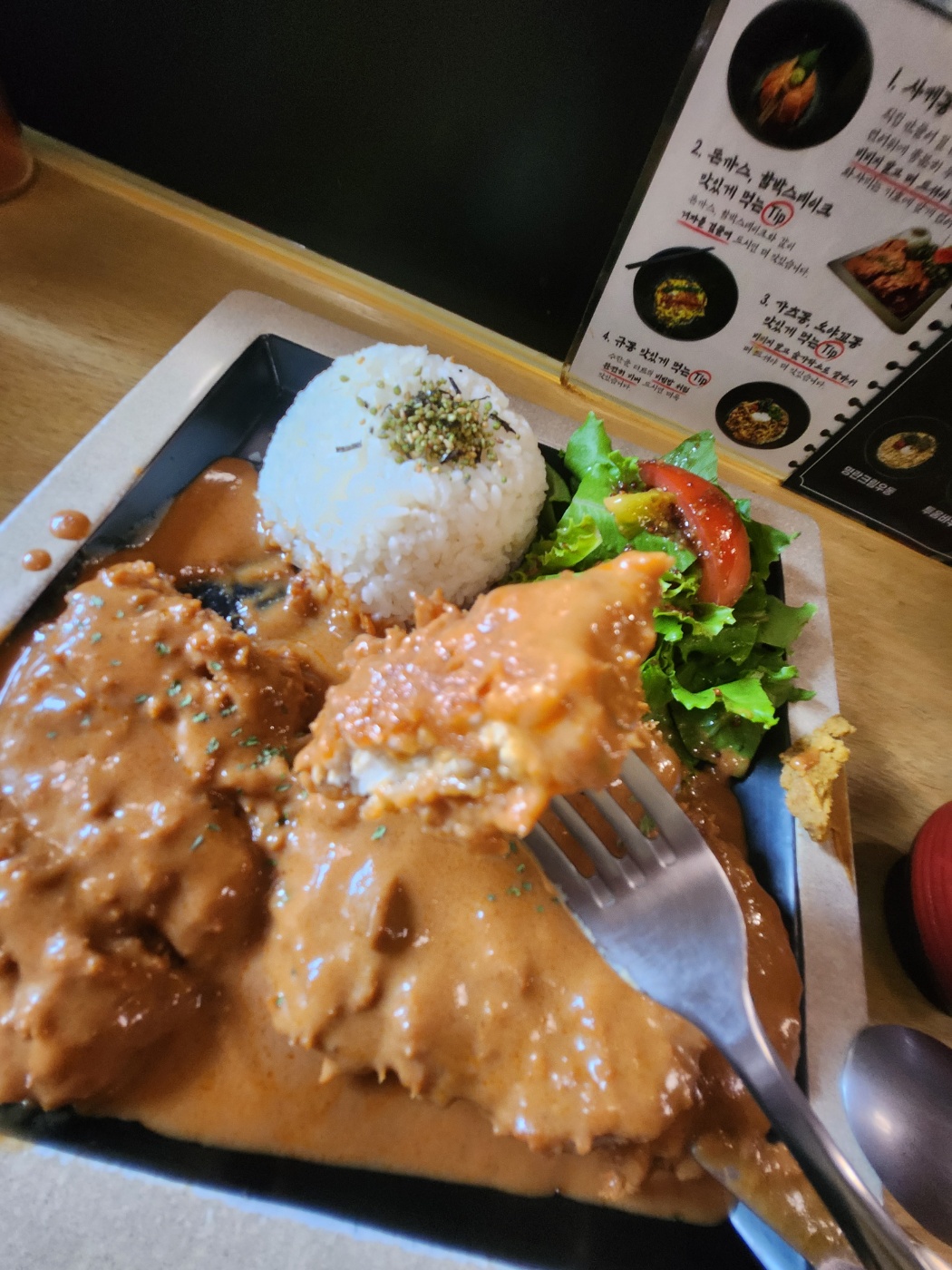 - 돈까스는 바삭한 튀김옷 안에 부드러운 고기가 가득 들어 있어 씹을 때마다 고소함이 퍼졌습니다. 튀김옷이 두껍지 않아 느끼하지 않았어요.