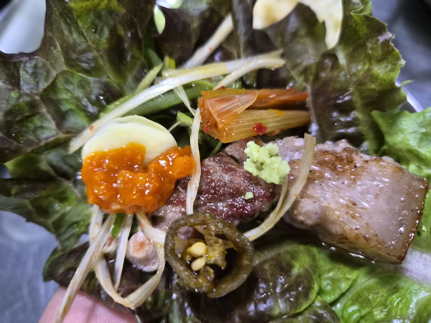 - 제주생목살은 오겹살보다 담백한 맛이 돋보였습니다. 살코기와 지방이 적절히 어우러져 쫄깃하면서도 담백한 식감이 일품이었고, 쌈에 싸서 먹으니 부담 없이 즐길 수 있었습니다.
