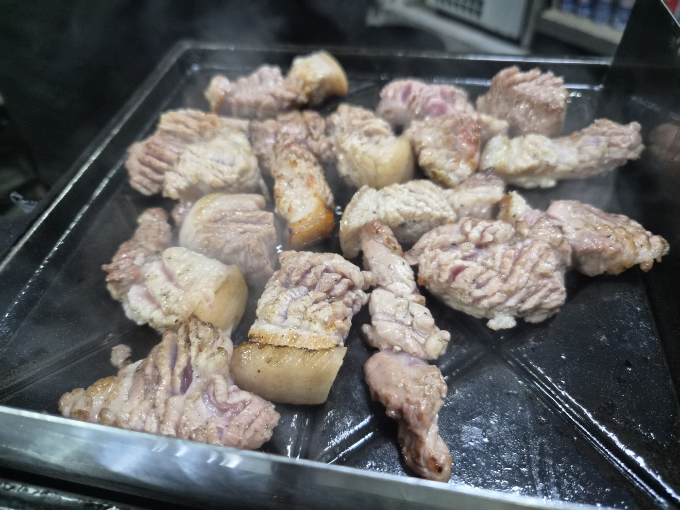 - 제주오겹살은 두께가 꽤 두툼해서 불판에 올리자마자 지글지글 소리가 울려 퍼졌습니다. 구워지면서 흘러나오는 기름에 마늘을 곁들이니 풍미가 배가되더군요. 한 점을 입에 넣자 육즙이 터져 나오면서 고소함이 가득 퍼졌습니다.