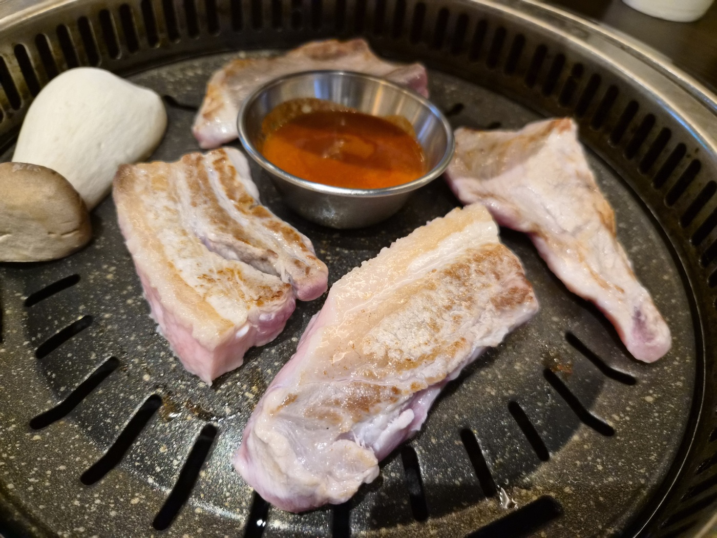 다음으로 맛본 숙성가브리살은 삼겹살보다 조금 더 쫄깃하고 담백한 매력이 있었어요. 씹을수록 고소한 맛이 배어 나오고, 삼겹살보다 덜 느끼해서 계속 손이 갔습니다. 소금에만 살짝 찍어 먹어도 훌륭했고, 파절이나 쌈채소와 곁들이면 또 다른 매력이 느껴졌습니다.