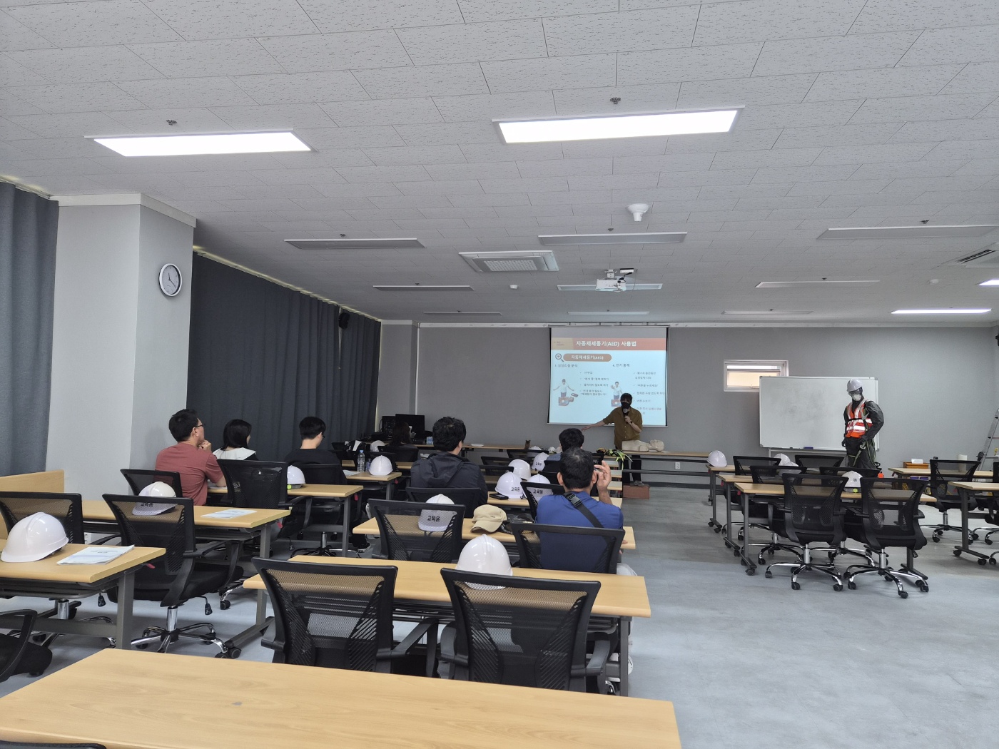 - 실제 건설 현장을 재현한 교육장에서 추락 방지 장치 사용법을 직접 체험합니다.