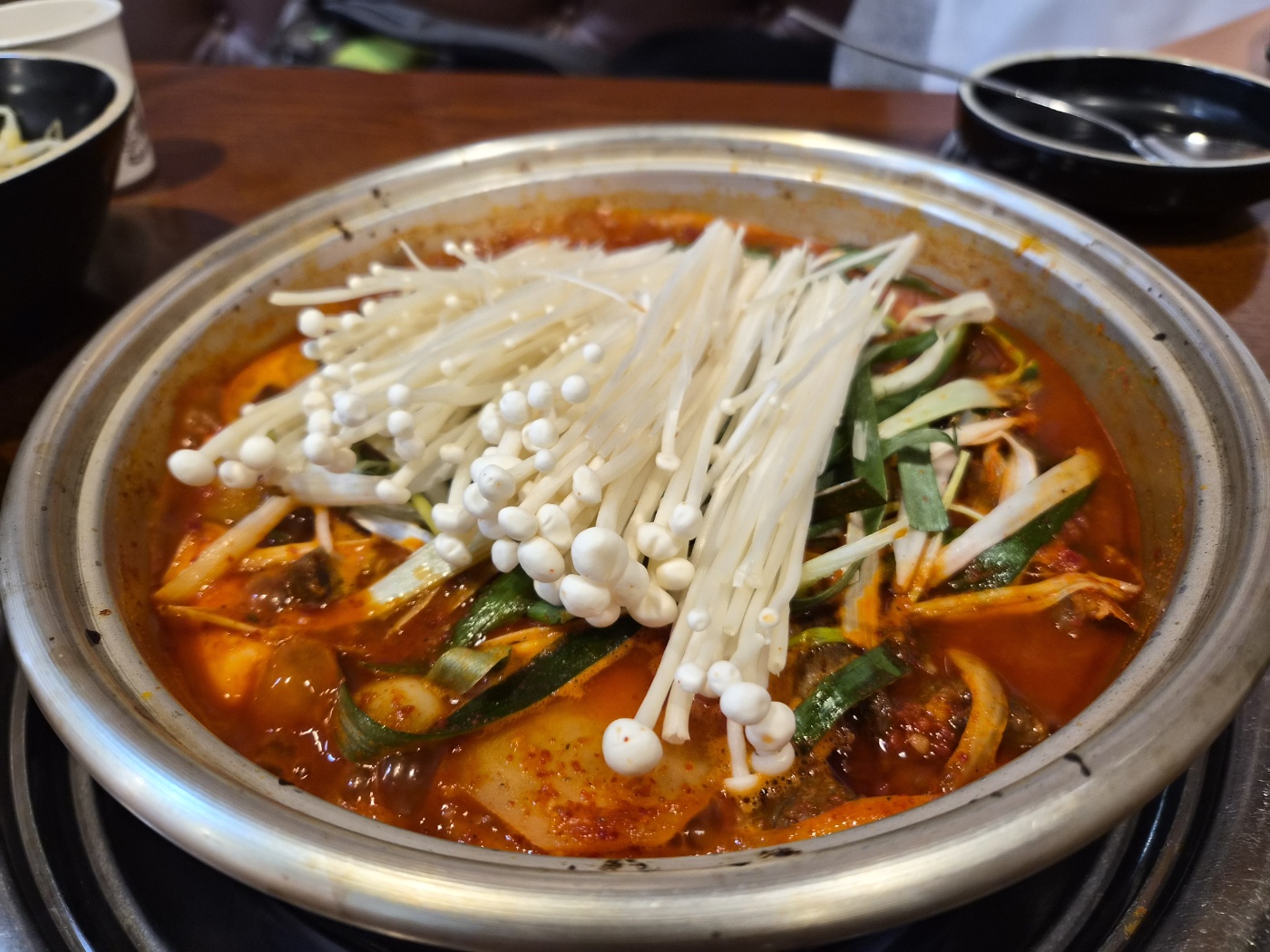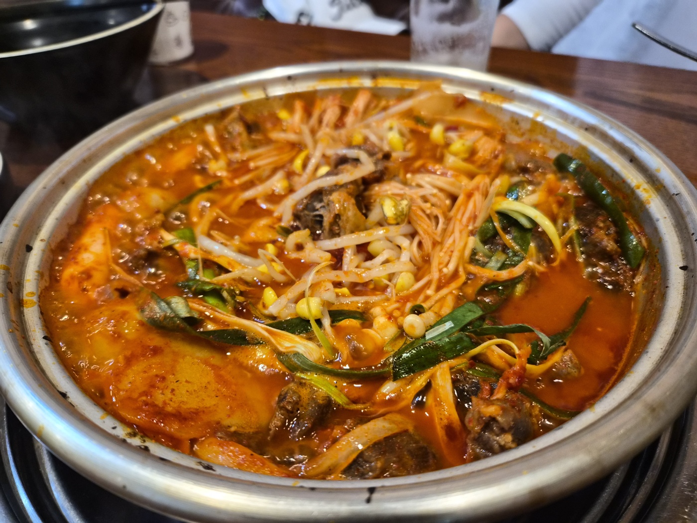 냄비가 끓자 은은하게 풍겨오는 매콤한 향이 식욕을 자극했습니다. 윤기 흐르는 양념 위로 큼직하게 올려진 소갈비들이 먹음직스러웠고, 사이사이에 감자, 콩나물, 각종 채소가 어우러져 색감까지 화려했습니다.