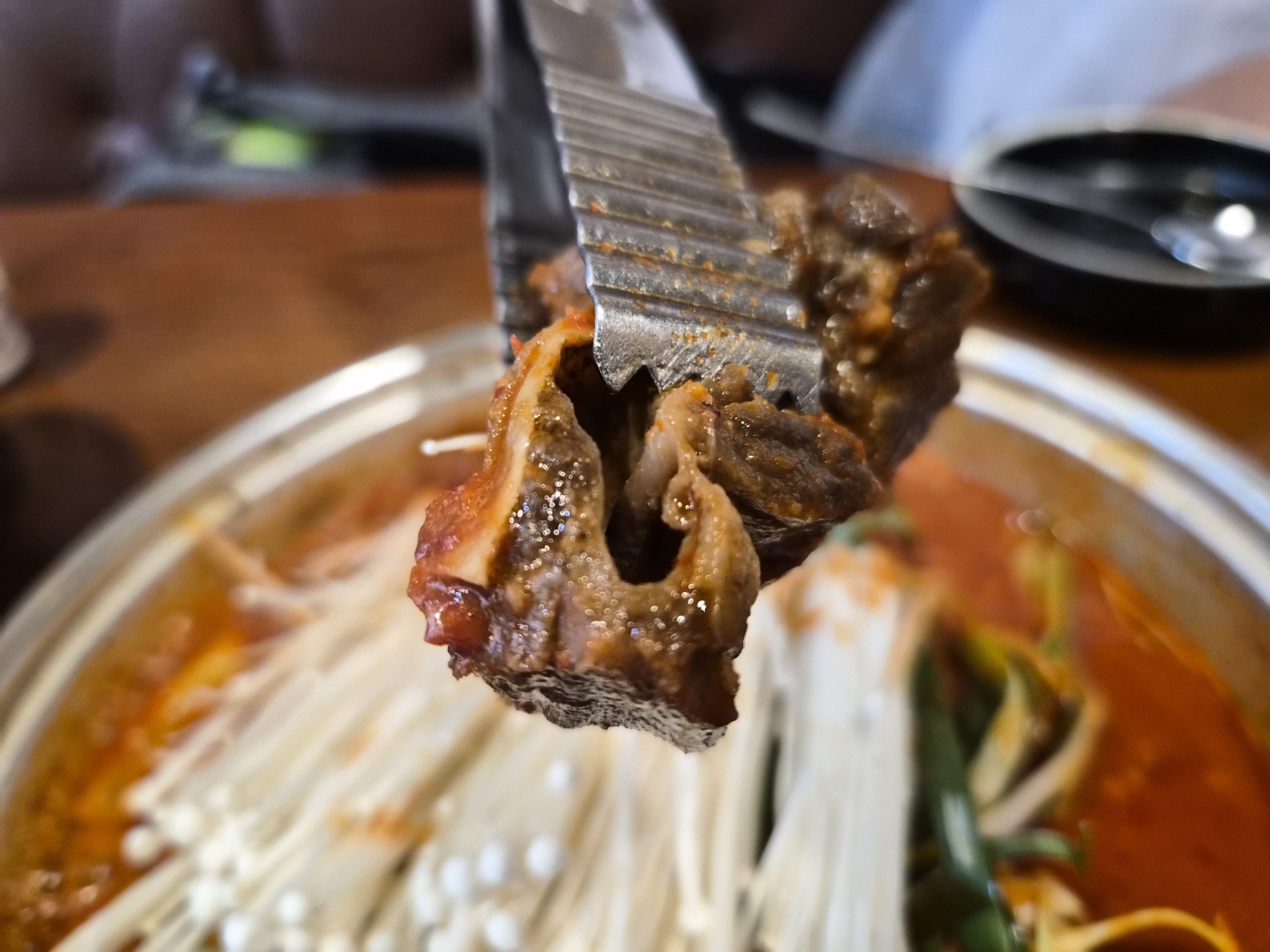 잠시 후, 커다란 냄비에 푸짐하게 담긴 소갈비찜이 등장했습니다. 눈앞에 펼쳐진 비주얼만으로도 오늘 저녁은 성공적이라는 확신이 들었죠.