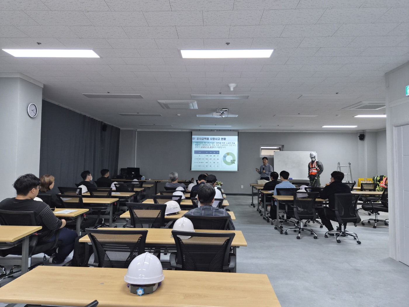 추락·낙하물·감전·협착·붕괴 등 5대 재해 유형을 실제 사례 영상과 모형을 통해 학습합니다. 예를 들어, 작업 중 안전난간이 빠진 경우 어떻게 사고로 이어지는지를 직접 체험함으로써, “작은 방심이 큰 사고로 이어질 수 있다”는 사실을 실감합니다. 교육생들은 실제 사고 재현 영상을 분석하며, “왜 사고가 났는가”보다 “어떻게 막을 수 있었는가”를 중심으로 사고 예방 사고력을 기릅니다.
