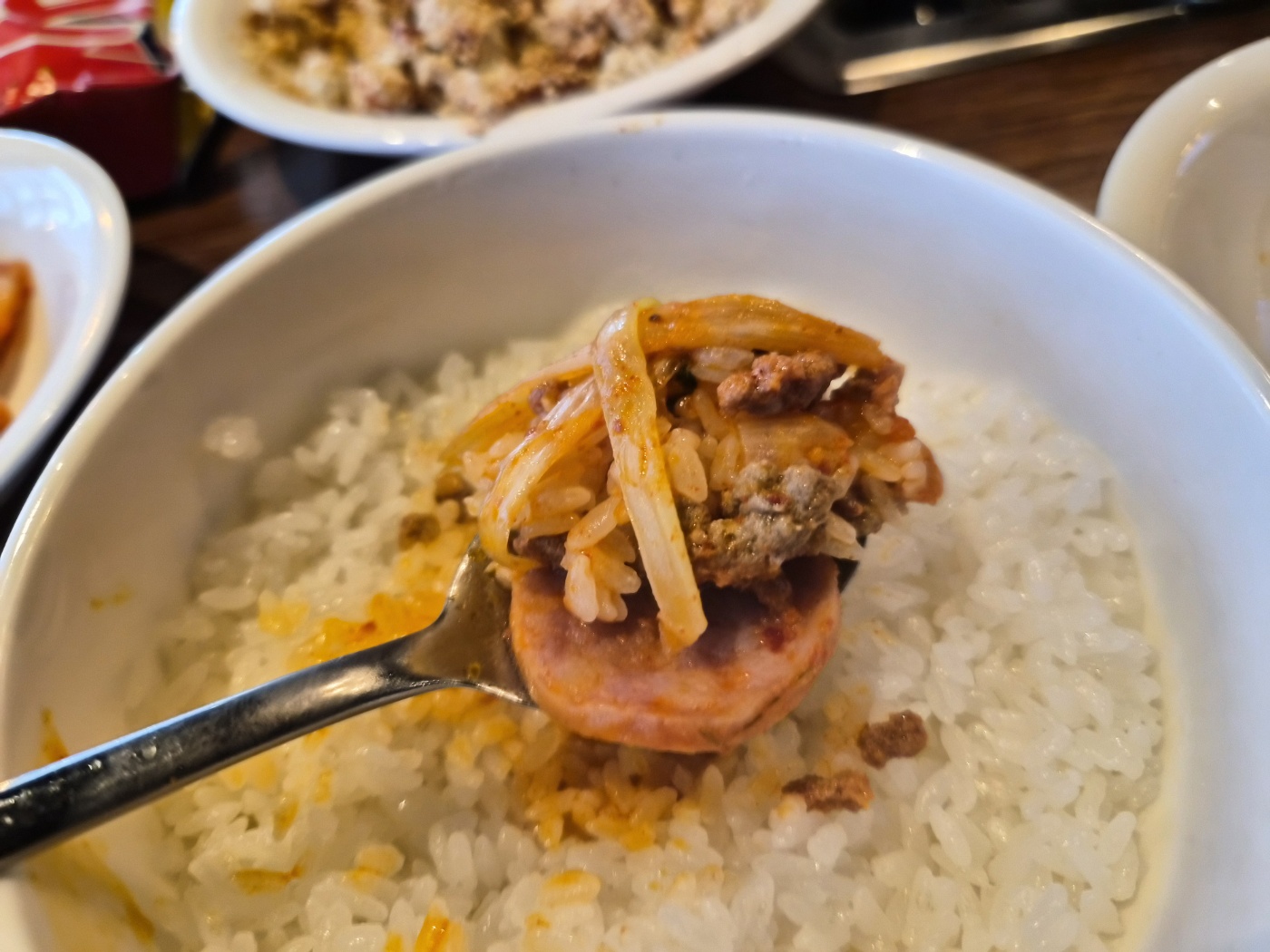 기본으로 나오는 반찬도 소박하지만 깔끔했어요. 신김치, 콩나물 등 부대찌개의 짭조름한 맛을 잘 받쳐주는 구성이었습니다. 특히 햄과 소시지가 풍성하게 들어 있어서 고기 건더기를 듬뿍 건져 먹는 재미도 있었습니다. 고기류와 김치가 잘 익은 시점에서 밥 한 숟가락과 함께 먹으니, 속이 확 풀리는 듯한 진한 국물의 매력이 입안 가득 퍼졌습니다.