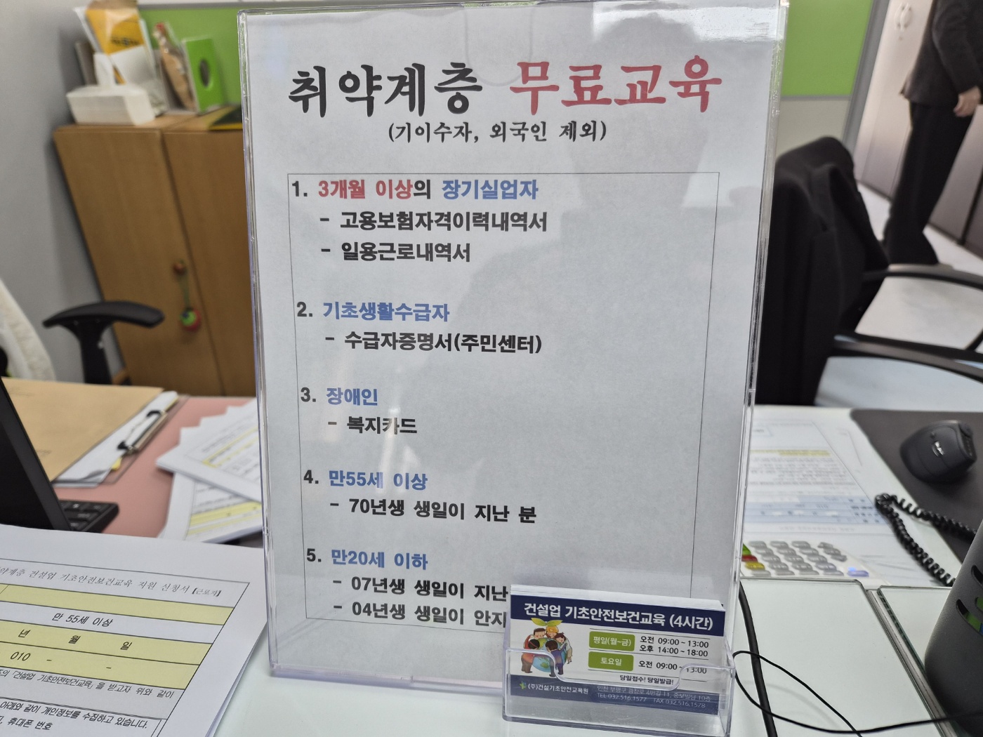 취약계층 무료교육 대상자에 해당하는 근로자분들은 증빙서류를 지참하면 무료로 수강할 수 있습니다.