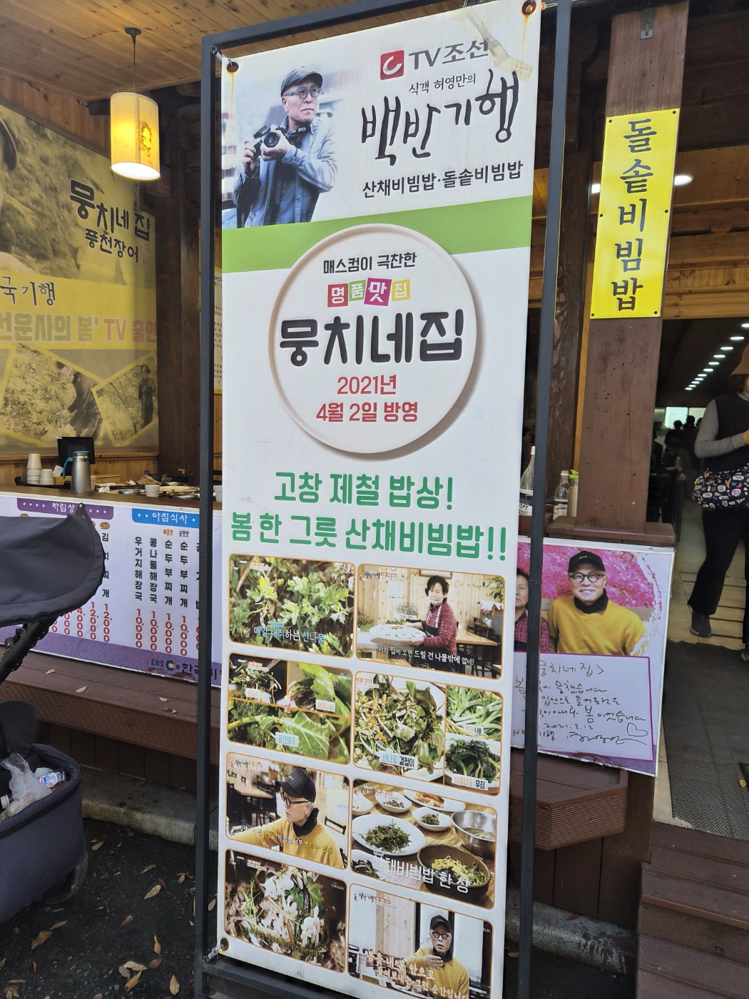 주말이라서 그런건지 사람들이 엄청 많았습니다. 웨이팅을 20분 정도 했어요. 들어서자마자 풍겨오는 음식 냄새가 정말 구수했습니다. 홀은 깔끔하게 정리되어 있고, 나무 테이블이 주는 따뜻한 색감이 ‘시골집 밥상’ 같은 분위기를 더해줬어요. 입구와 벽면에는 백반기행 허영만이 다녀간 곳이라고 광고들이 되어 있어 눈에 띄었습니다.