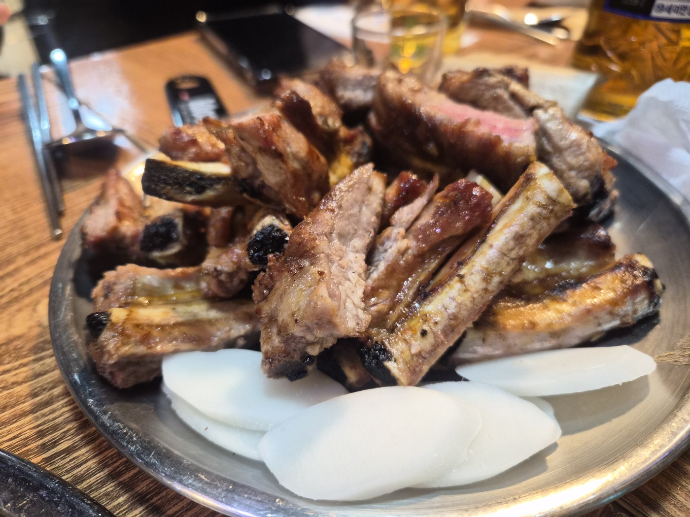사실 이 집의 진짜 매력은 등갈비와 소주의 조합입니다. 짭조름한 소금맛에는 첫 잔이 술술 들어가고, 매운등갈비엔 혀를 달래주는 얼음 소주 한 잔이 최고죠. 매운 양념에 고기를 집어 먹고 소주 한 모금 넘기면, 그 짜릿한 맛이 입안에서 한참을 맴돕니다.
