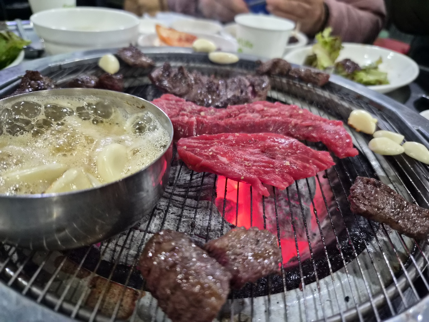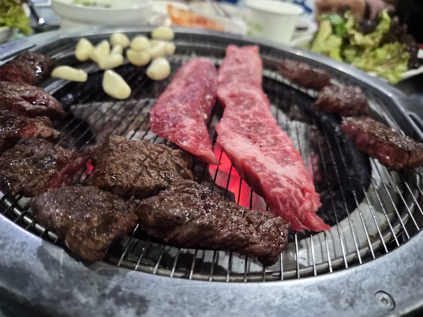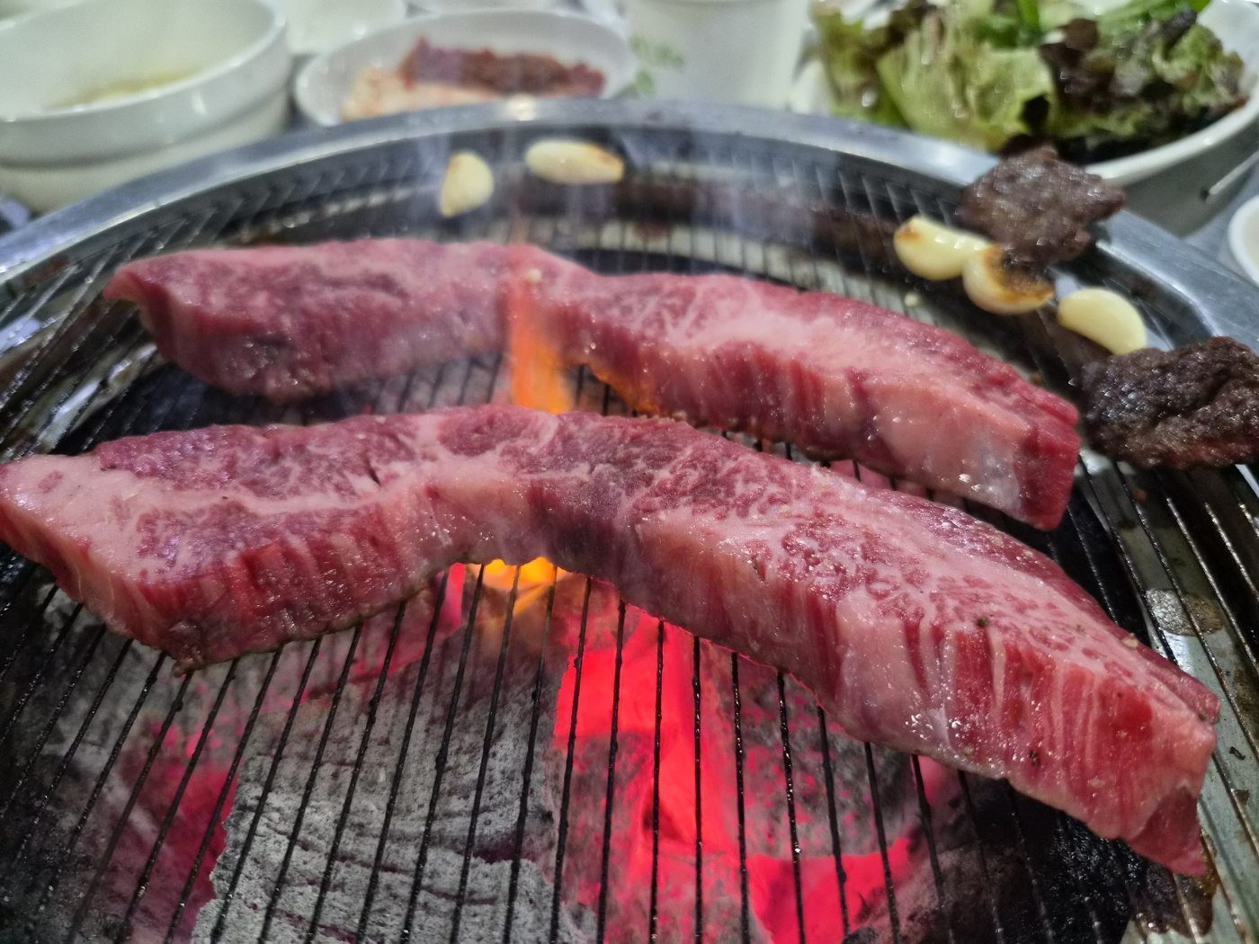 기본 반찬도 소소하지만 정갈했습니다. 특히 겉절이와 묵은지, 명이나물, 깻잎절임이 고기와 잘 어울렸고, 고기 기름에 구워 먹는 김치와 마늘은 감칠맛을 더해줬어요. 한우의 풍미를 해치지 않으면서 입맛을 돋워주는 구성이었어요.