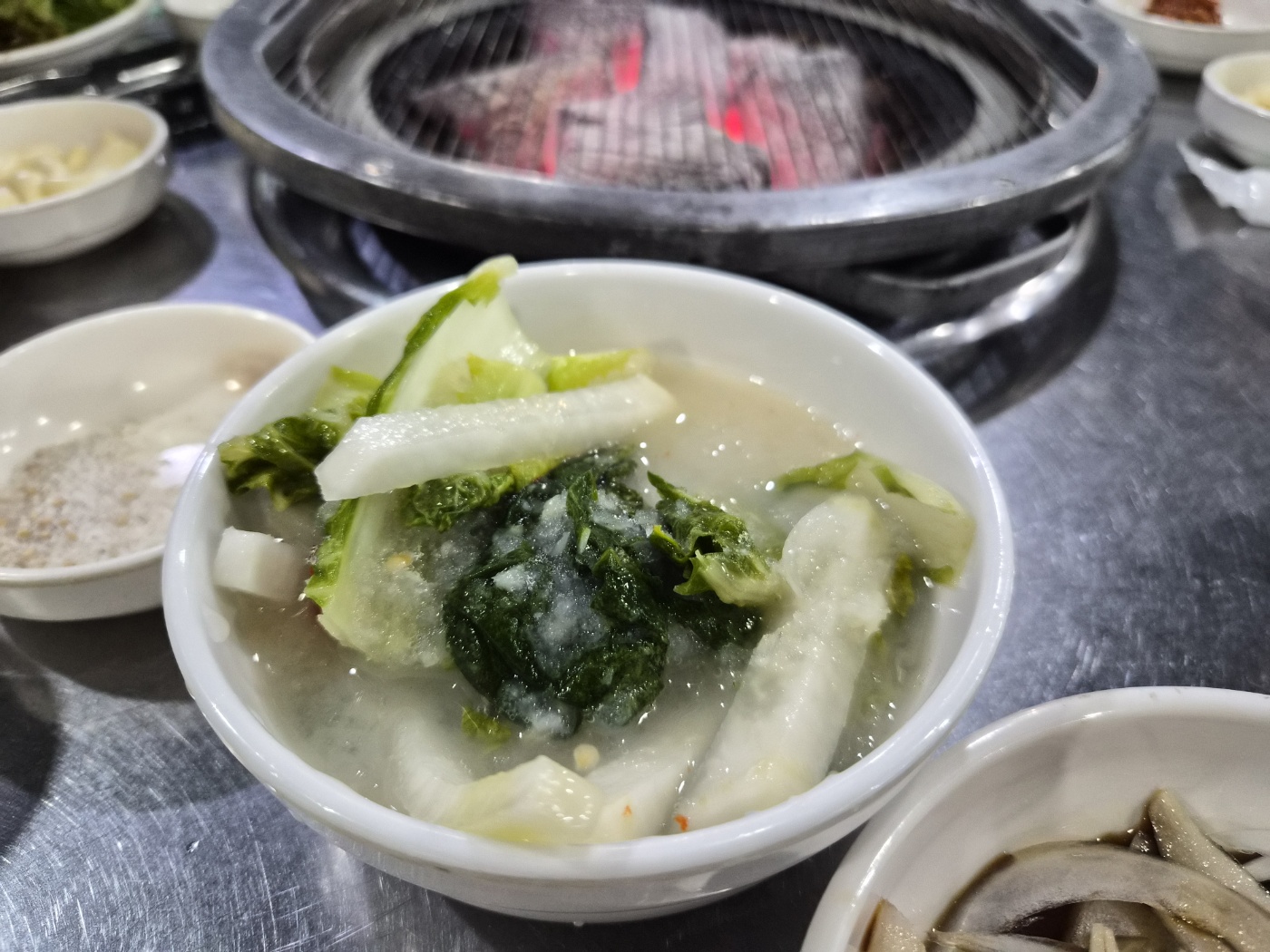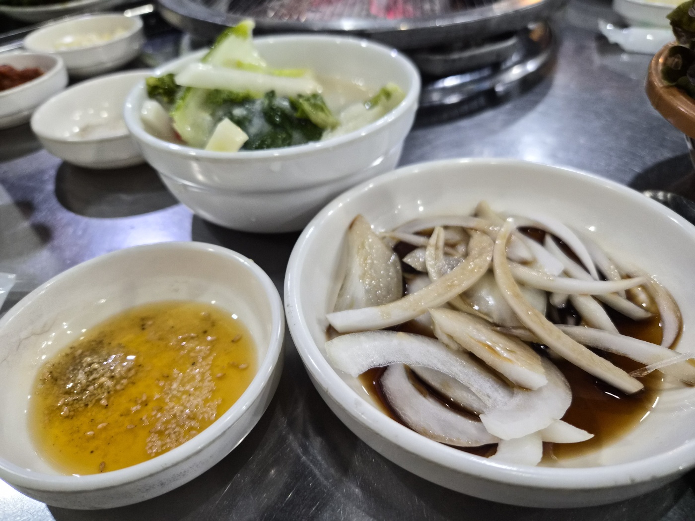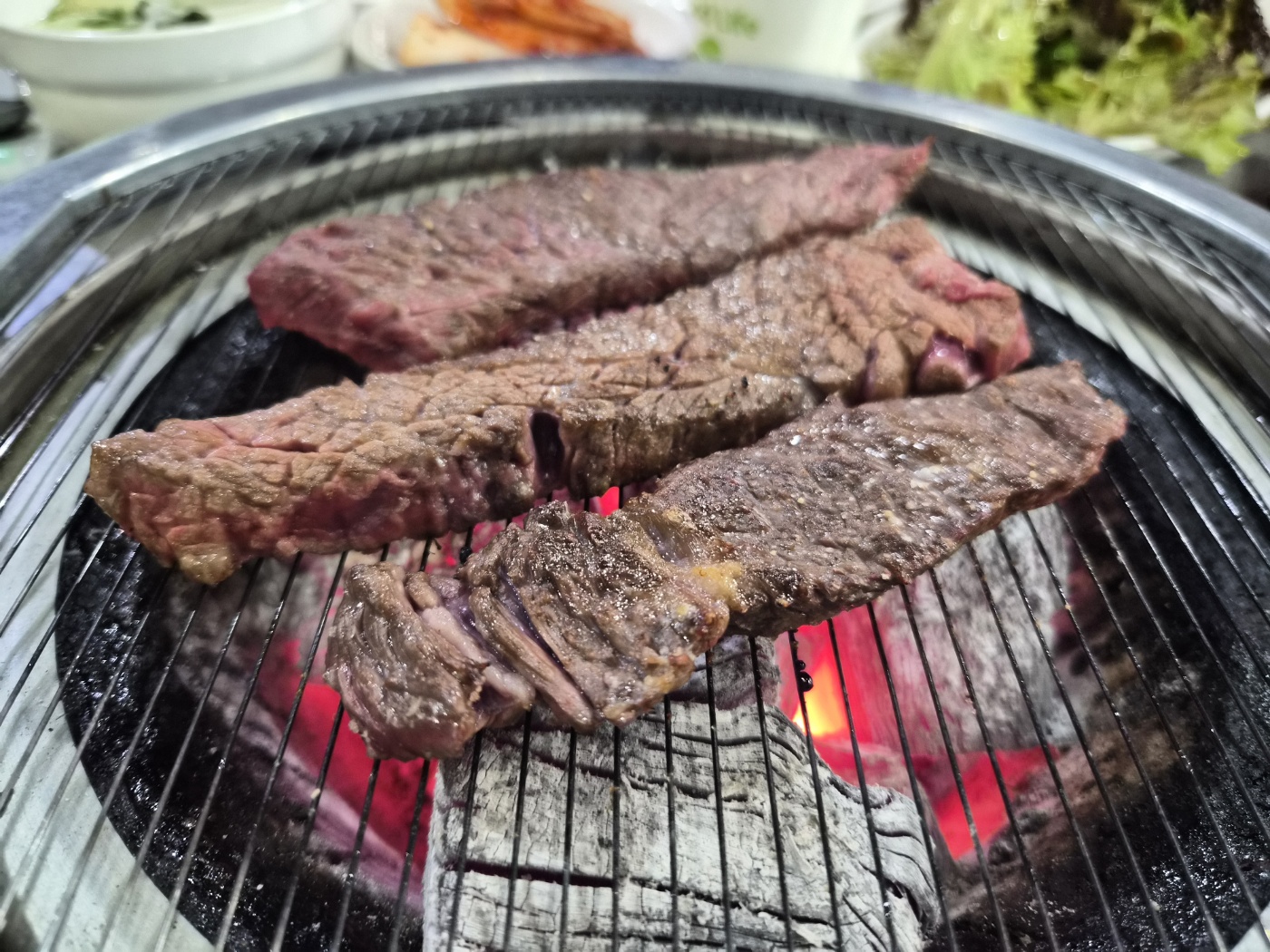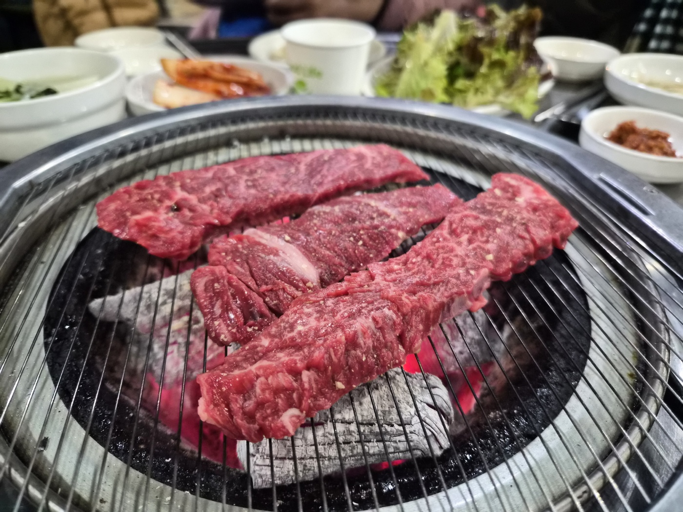기본 반찬도 소소하지만 정갈했습니다. 특히 겉절이와 묵은지, 명이나물, 깻잎절임이 고기와 잘 어울렸고, 고기 기름에 구워 먹는 김치와 마늘은 감칠맛을 더해줬어요. 한우의 풍미를 해치지 않으면서 입맛을 돋워주는 구성이었어요.