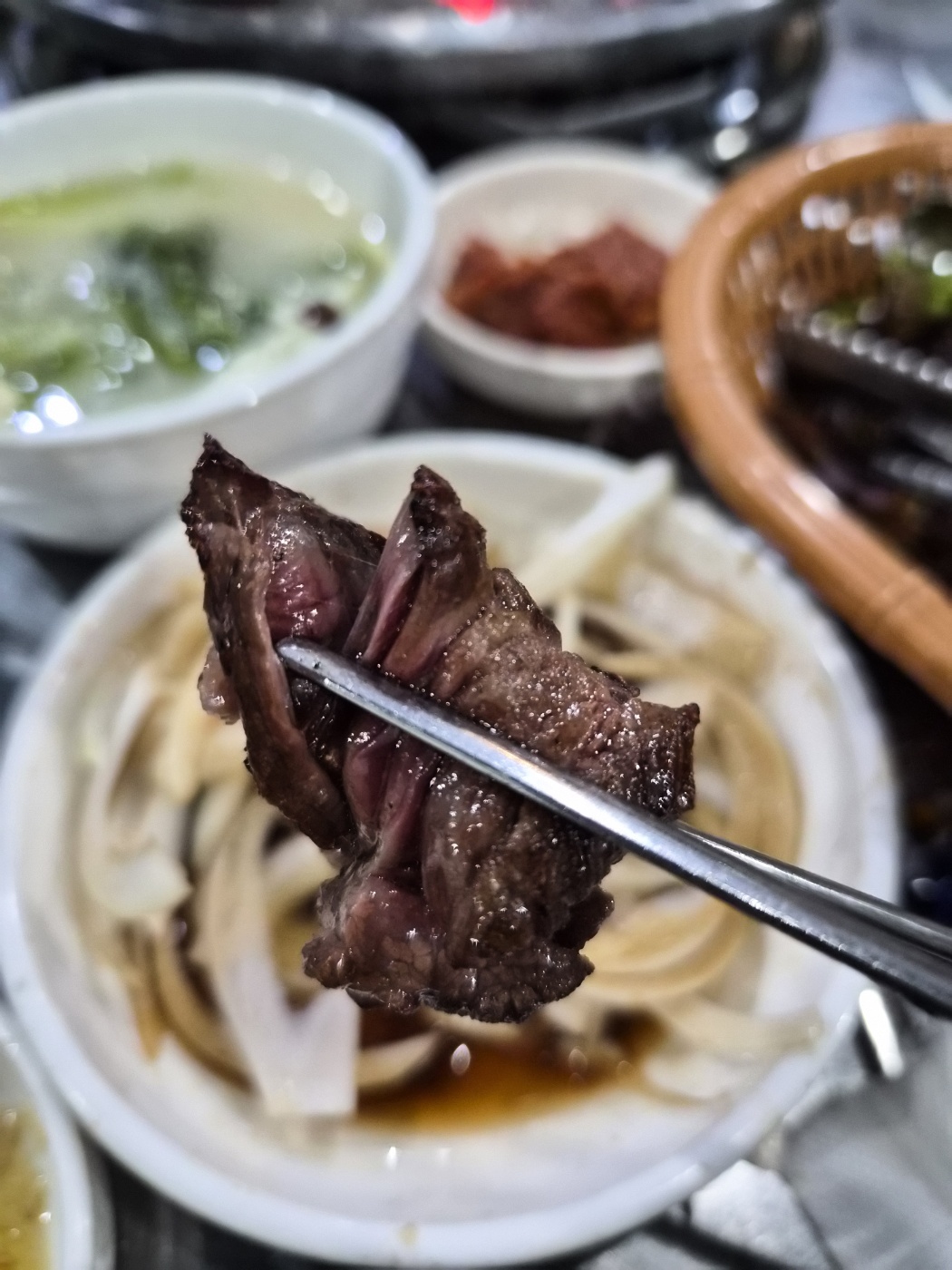 고기를 어느 정도 먹고 난 뒤, 주문했던 소고기찌개가 나왔습니다. 한우를 메인으로 다루는 식당이라 그런지, 찌개에서도 진한 소고기 육수 맛이 확실히 느껴졌어요. 국물은 얼큰하면서도 깊은 맛이 났고, 안에는 큼직한 소고기 덩어리와 두부, 버섯, 대파가 푸짐하게 들어 있었습니다. 무엇보다 육수가 맑지 않고 진하게 우러나 있어서, 고기 먹고 느끼할 틈 없이 깔끔하게 마무리할 수 있는 메뉴였어요. 가족 모두 찌개 국물까지 남김없이 비웠을 정도로 만족스러웠습니다.