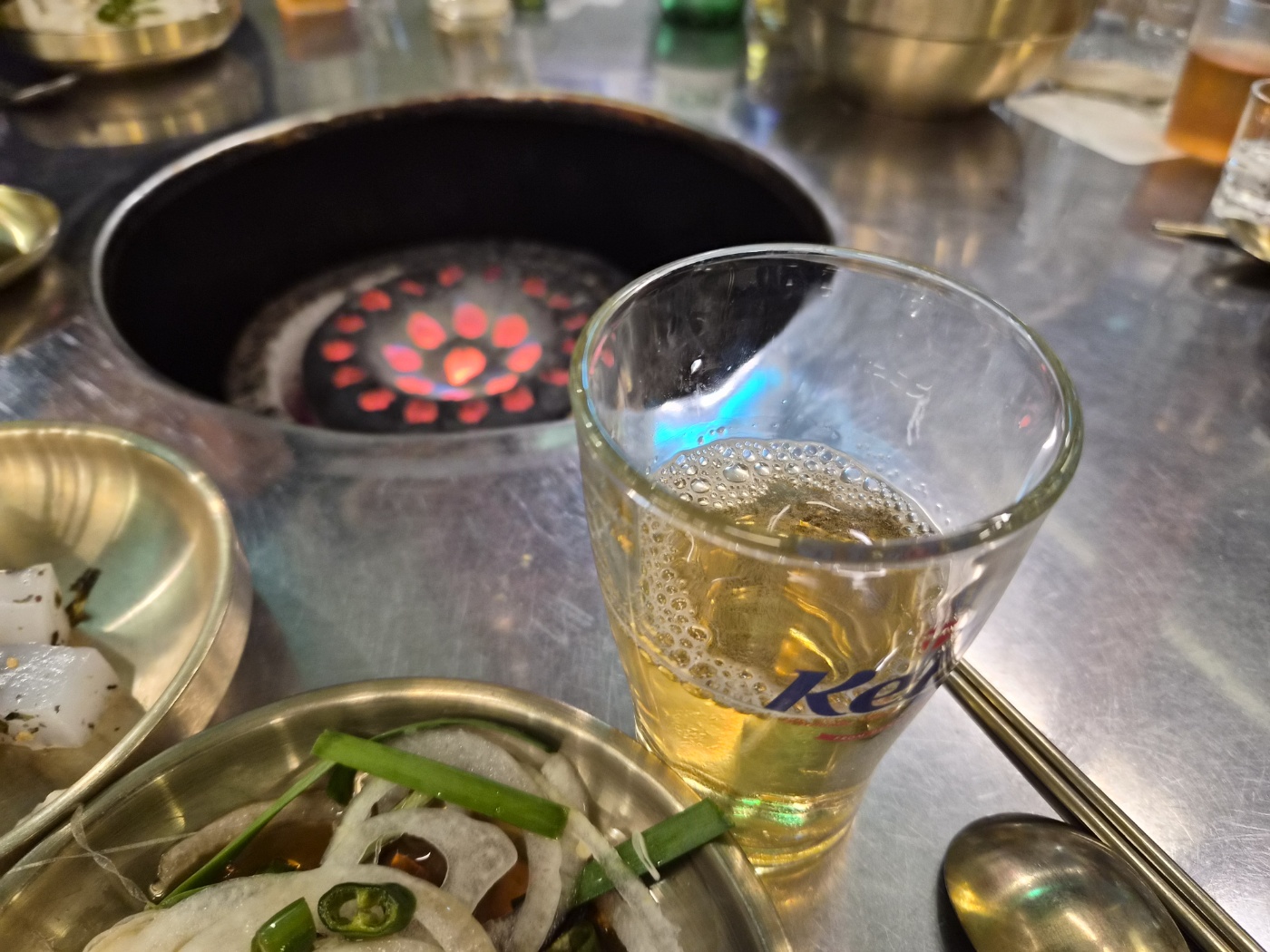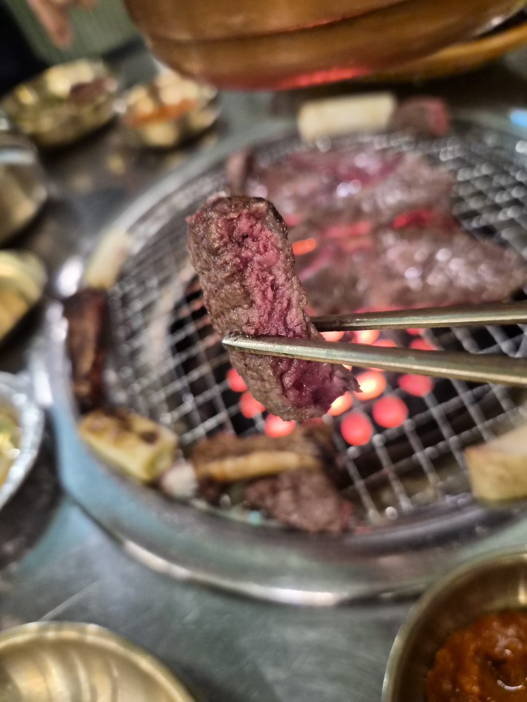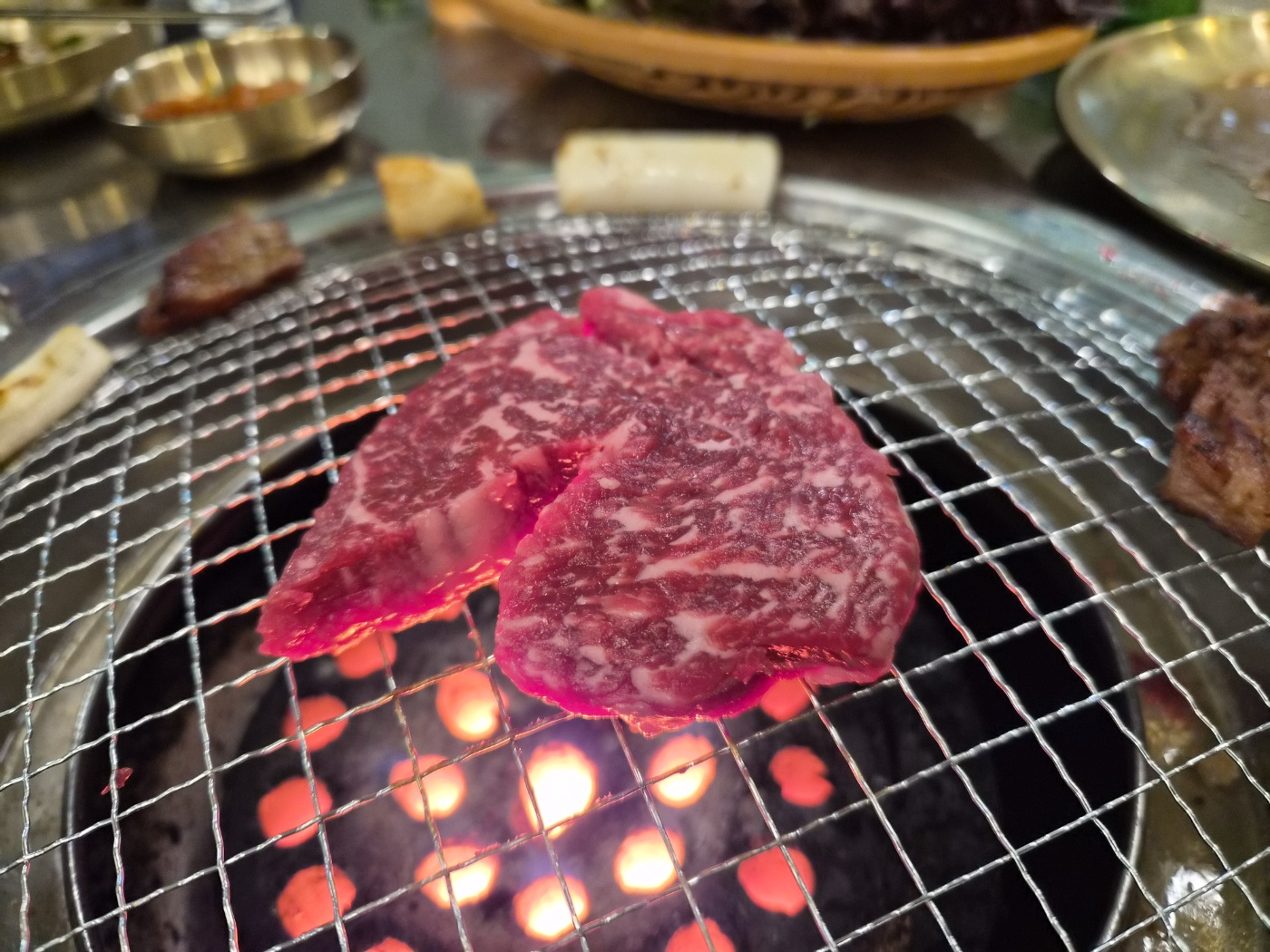 연탄불이 제대로 올라오자 직원분이 “한우는 너무 자주 뒤집지 마세요”라고 친절히 알려주셨어요. 불 위에 고기를 올리자 치익- 소리와 함께 고소한 향이 퍼지는데, 그 순간 다들 말이 끊겼습니다. 고기 굽는 장면만 바라보며 침을 꿀꺽 삼켰죠.
