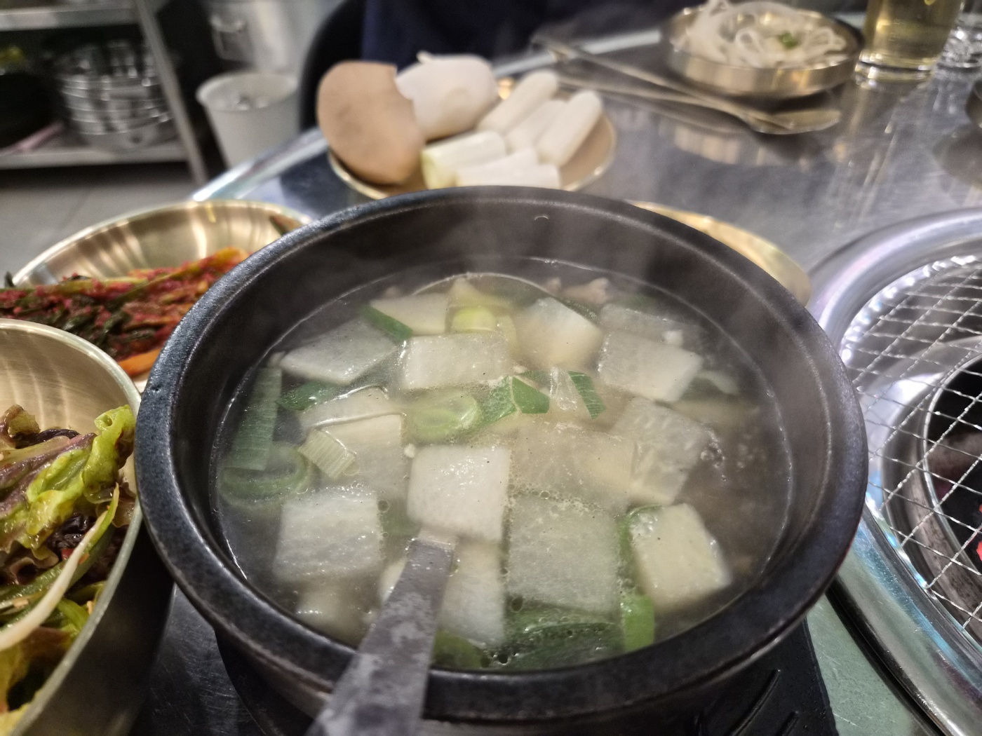상차림은 깔끔하면서도 필요한 게 다 있었어요 — 상추, 파절이, 마늘, 그리고 고소한 된장소스까지.