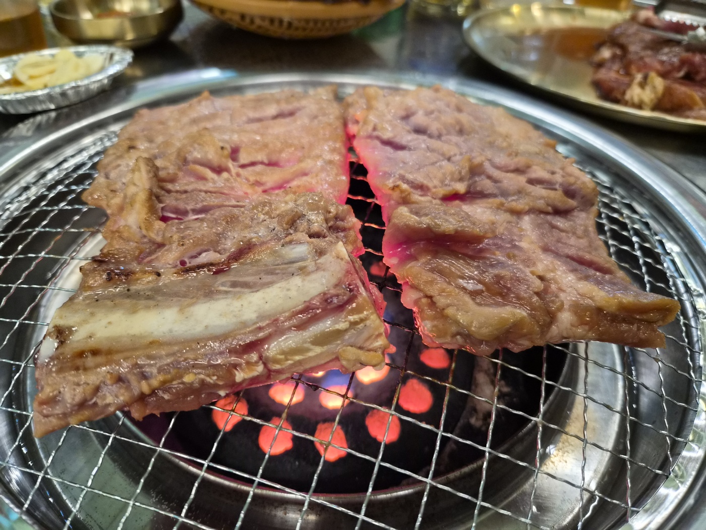 한우로 입맛을 달군 후에는 자연스럽게 돼지왕갈비(18,000원)를 주문했습니다. 커다란 갈비가 양념에 촉촉이 젖어 나왔는데, 보기만 해도 군침이 돌았어요. 불판 위에 올리자마자 향이 폭발합니다 — 달콤짭조름한 냄새에 주변 테이블에서도 시선이 살짝 모일 정도였어요. 돼지왕갈비는 양념이 진하지 않고 적당히 스며들어 있어서, 한입 베어물면 양념의 달콤함 → 고기의 쫄깃함 → 연탄불의 불향이 순서대로 느껴집니다. 특히 지방 부분이 살짝 바삭하게 구워지면서 불향이 입안에 퍼질 때, 소주 한 잔이 절로 올라가죠.