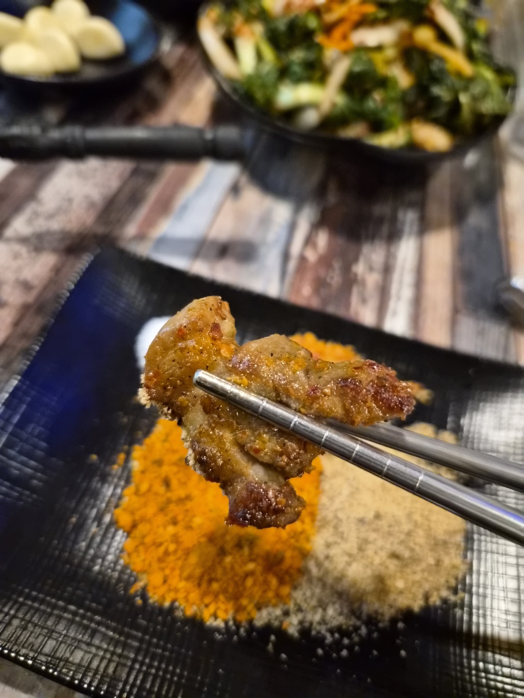 양 특유의 냄새가 거의 없고, 지방이 적당히 붙어 있어서 씹을수록 고소하고 담백해요. 함께 간 친구 한 명은 양고기를 처음 먹어봤는데, “이 정도면 돼지고기보다 낫다”라며 놀라워했습니다. 일반 꼬치보다 두툼해서 씹는 맛이 확실하고, 고기의 결이 부드럽게 풀리면서 향긋한 기름이 혀끝에 남아요.