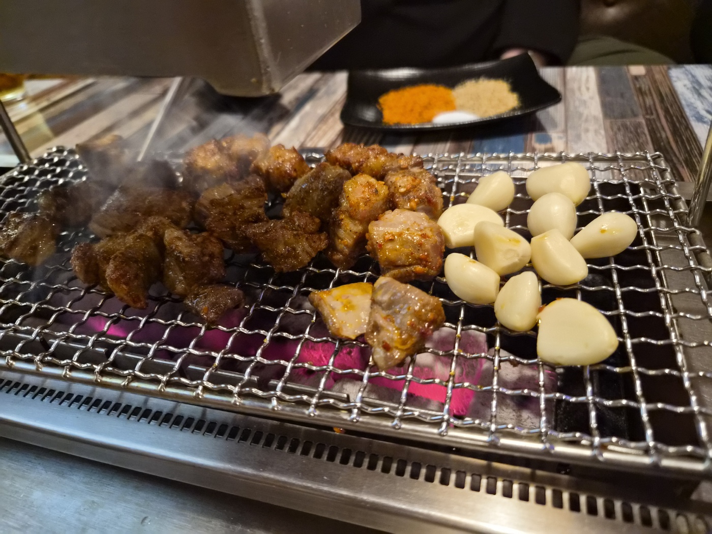 문을 열고 들어가면 구워지는 양꼬치 냄새가 향신료와 섞여 식욕을 폭발시키죠. 테이블마다 자동 꼬치구이 기계가 설치돼 있어 손에 기름 묻힐 걱정 없이 먹기 편했습니다. 좌석은 깔끔하고 테이블 간 간격도 넓어서 대화하기에 적당했어요.