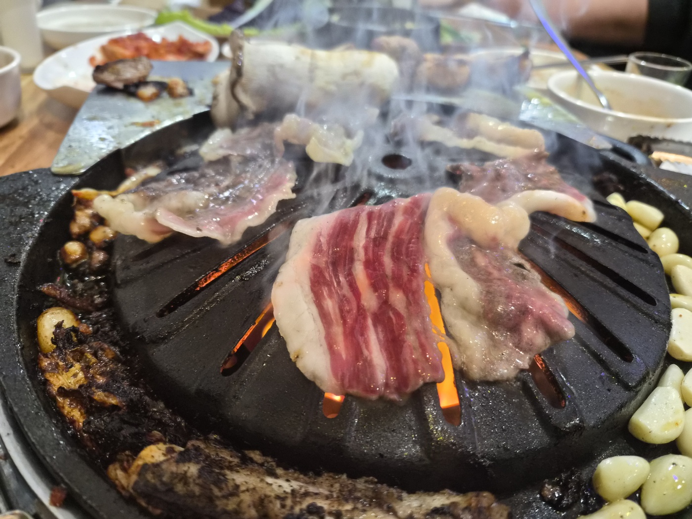 돼지생갈비를 어느 정도 즐긴 뒤에는 한우차돌박이를 올렸습니다. 불판에 닿자마자 지글지글 소리가 나며 고소한 향이 퍼졌고, 얇은 차돌답게 금세 익어 바로 먹을 수 있었습니다. 기름기가 있는 편이지만 느끼함보다는 고소함이 더 강해 부담 없이 먹을 수 있었고, 특히 맥주와의 궁합이 좋았습니다. 고기 종류를 바꿔가며 먹으니 끝까지 질리지 않고 즐길 수 있었습니다.