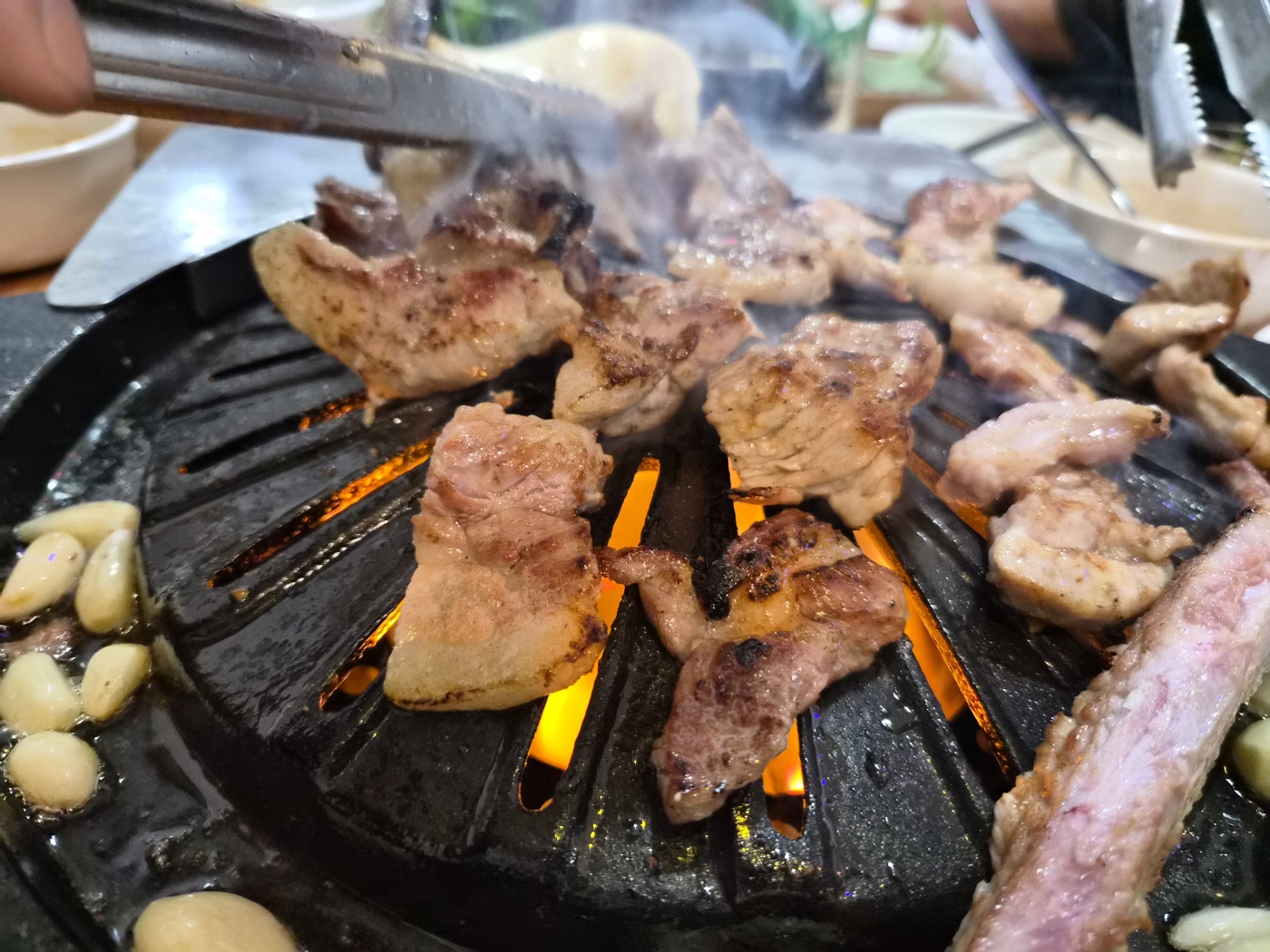 가장 먼저 불판 위에 올라간 메뉴는 돼지생갈비였습니다. 고기 색이 선명하고 윤기가 돌아 첫인상부터 신선해 보였습니다. 직원분이 처음에는 직접 구워주셔서 고기 상태를 살펴가며 익혀주셨는데, 덕분에 처음 한 점부터 실패 없이 맛있게 먹을 수 있었습니다.