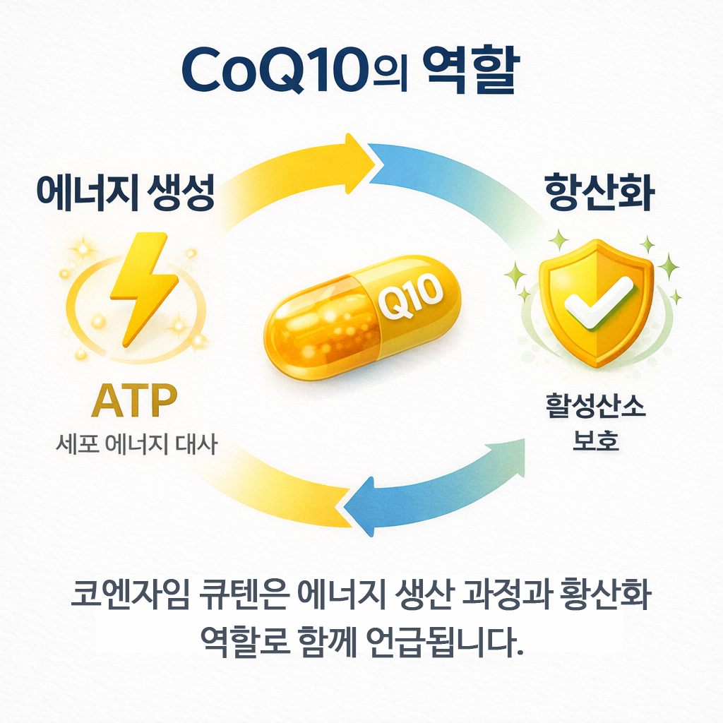 코엔자임 큐텐은 항산화/에너지 대사와 연결되어 이야기되지만, 체감은 보통 수면·운동·식사·스트레스 같은 생활 요소에 크게 좌우됩니다. 그래서 “먹었는데 모르겠던데?”도 흔해요.