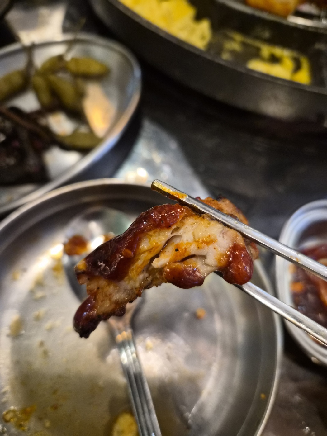 소금숯불계고기와 번갈아 먹으니까 조합도 좋았습니다. 하나는 담백하고 고소한 매력, 다른 하나는 양념의 감칠맛과 매콤함이 살아 있어서 전혀 물리지 않았어요. 처음 가는 분이라면 한 가지 메뉴만 고르기보다 이 두 가지를 함께 주문하는 걸 추천하고 싶을 정도였습니다.
